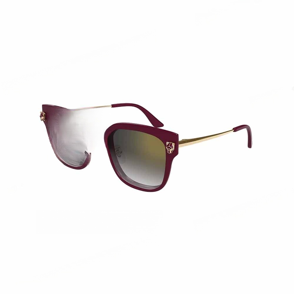 當優雅遇上野性:這款來自 Cartier 「Panthère de Cartier」太陽眼鏡,以深酒紅色鏡框搭配金屬細節,散發低調奢華氣息。豹頭標誌在鏡腿間閃現,象徵品牌經典的「Panthère」精神——自信、俐落、無懼。鏡片採漸層設計,讓光線柔和又具型格。不論日常通勤或假日出遊,戴上它就是一種態度宣言。